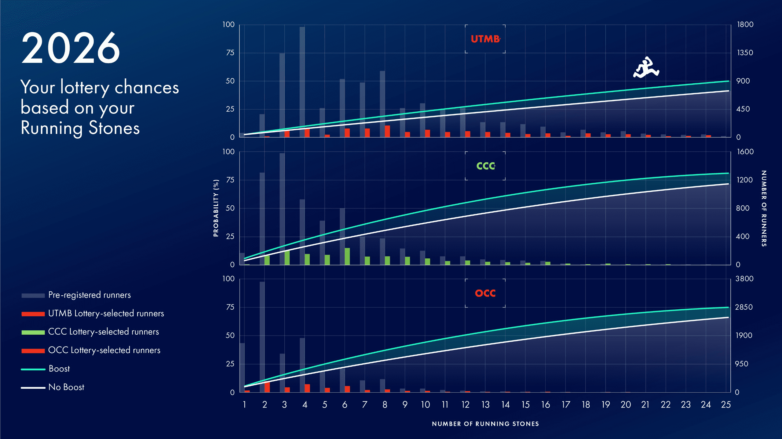 In 2025 for UTMB you needed (on average) 5.4 stones, in 2024 5.3. So for 2026 this doubled. If you want to see a graph, where the probability is broken down by race and number of stones, UTMB created one for you.